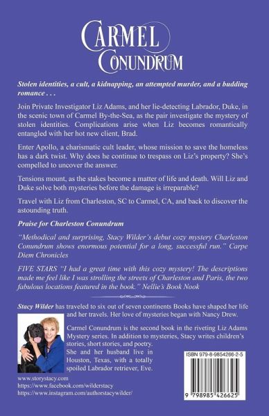 Stolen identities, a cult, a kidnapping, an attempted murder, and a budding romance . . . Join Private Investigator Liz Adams, and her lie-detecting Labrador, Duke, in the scenic town of Carmel By-the-Sea, as the pair investigate the mystery of stolen identities. Complications arise when Liz becomes romantically entangled with her hot new client, Brad. Enter Apollo, a charismatic cult leader, whose mission to save the homeless has a dark twist. Why does he continue to trespass on Liz's property? She's compelled to uncover the answer. Tensions mount, as the stakes become a matter of life and death. Will Liz and Duke solve both mysteries before the damage is irreparable? Travel with Liz from Charleston, SC to Carmel, CA, and back to discover the astounding truth.