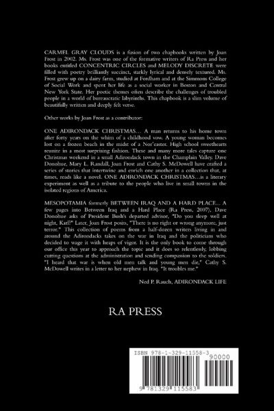 CARMEL GRAY CLOUDS is a fusion of two chapbooks written by Joan Frost in 2002. Ms. Frost was one of the formative writers of Ra Press and her books entitled CONCENTRIC CIRCLES and MELODY DISCRETEwere filled with poetry brilliantly succinct, starkly lyrical and densely textured. Ms. Frost grew up on a dairy farm, studied at Fordham and at the Simmons College of Social Work and spent her life as a social worker in Boston and Central New York State. Her poetic themes often describe the challenges of troubled people in a world of bureaucratic labyrinths. This chapbook is a slim volume of beautifully written and deeply felt verse.