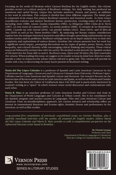 Focusing on the works of Mexican writer Carmen Boullosa for the English reader, this volume provides access to a critical analysis of Boullosa's writings. Her daily writing has produced an enormous and varied literary corpus that includes narrative, theater, and poetry, in addition to her work in television. This volume is divided into three different segments. The initial part is composed of six essays that analyze Boullosa's narrative and theatrical works. In these essays contributors evaluate and analyze Boullosa's literary production, covering many of her novels, including 'Antes' (1989), 'Llanto: novelas imposibles' (1992), 'La Milagrosa' (1993) 'Cielos de la Tierra' (1997), 'La otra mano de Lepanto' (2005), 'La novela perfecta' (2006), 'El complot de los Románticos' (2009), 'Cuando me volví mortal' (2010), 'Las paredes hablan' (2012), 'Texas' (2014), and 'El libro de Ana' (2019) as well as her 'Teatro herético' (1987). By analyzing her literary corpus, contributors explore how she reshapes historical narratives and offers thought-provoking commentaries on our modern society and its problems. Boullosa's writings invite an in-depth analysis due to their rich complexity and explorations of various themes, therefore this volume presents how her work has a significant social impact, prompting discussions on the topics of gender, power, history, social inequality, and cultural diversity while encouraging critical thinking and empathy. These critical essays are followed by an interview with the author. We decided to also include the Spanish version of this interview for those able to read it. Boullosa's essay, 'Épica mía/ Mi épica (My Epic)' concludes this volume. When reading this essay, we suggest to the reader to keep in mind how often her works provide a voice to characters for whom History refused to grant one. This volume will provide its reader with a key to discovering the many layers present in Boullosa's writing.