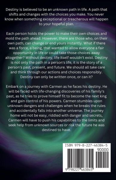 Embark on a journey with Carmen as he faces his destiny. He will face life-changing discoveries of his family's past as he tries to prove himself fit to become the next king and gain control of his powers. Carmen stumbles upon unknown dangers and challenges when he breaks the rules and accidentally falls into another universe. The journey home will not be easy. Riddled with danger and secrets, Carmen will have to push his capabilities to the limits and seek help from unknown sources or risk the future he was destined to have.