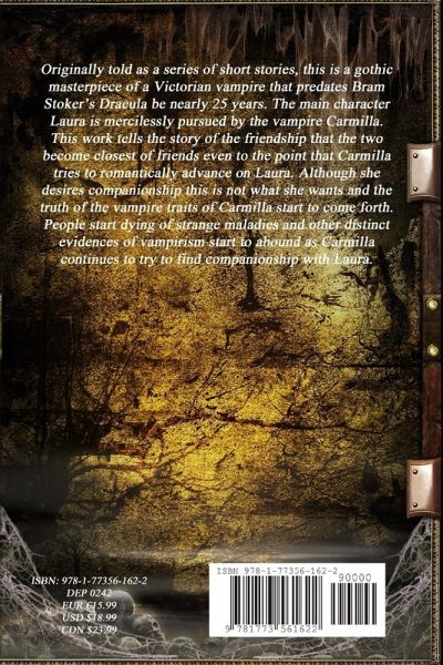 Originally told as a series of short stories, this is a gothic masterpiece of a Victorian vampire that predates Bram Stoker's Dracula be nearly 25 years. The main character Laura is mercilessly pursued by the vampire Carmilla. This work tells the story of the friendship that the two become closest of friends even to the point that Carmilla tries to romantically advance on Laura. Although she desires companionship this is not what she wants and the truth of the vampire traits of Carmilla start to come forth. People start dying of strange maladies and other distinct evidences of vampirism start to abound as Carmilla continues to try to find companionship with Laura.
