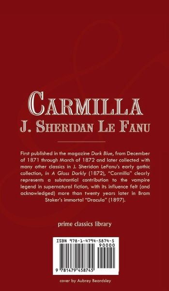 Carmilla is an 1872 Gothic novella by Irish author Joseph Sheridan Le Fanu and one of the early works of vampire fiction, predating Bram Stoker's Dracula (1897) by 26 years. First published as a serial in The Dark Blue (1871-72), the story is narrated by a young woman preyed upon by a female vampire named Carmilla, later revealed to be Mircalla, Countess Karnstein (Carmilla is an anagram of Mircalla). The character is a prototypical example of the lesbian vampire, expressing romantic desires toward the protagonist. The novella notably never acknowledges homosexuality as an antagonistic trait,…mehr
