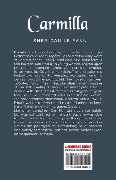 Carmilla by Irish author Sheridan Le Fanu is an 1872 Gothic novella. Many regard it as one of the early works of vampire fiction. Initially published as a serial form, it tells the story narrated by a young woman preyed upon by a female vampire named Carmilla, later revealed to be Mircalla, Countess Karnstein. The character is a typical example of the vampire, expressing romantic desires toward the protagonist. The novella has been adapted many times in film. Like other literary vampires of the 19th century, Carmilla is a similar product of a culture with strict sexual mores and tangible religious fear. While she selected exclusively female victims, she only becomes emotionally involved with a few. Le Fanu's work has been noted as an influence on Bram Stoker's masterwork of the genre, Dracula. Like other vampires, Carmilla had nocturnal habits, but was not confined to the darkness. She was able to change her form and to pass through solid walls. Carmilla works as a Gothic horror story because her victims are portrayed as succumbing to a perverse and unholy temptation that has severe metaphysical consequences for them.