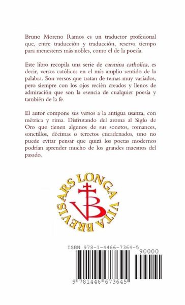 Bruno Moreno Ramos es un traductor profesional que, entre traducción y traducción, reserva tiempo para menesteres más nobles, como el de la poesía. Este libro recopila una serie de carmina catholica, es decir, versos católicos en el más amplio sentido de la palabra. Son versos que tratan de temas muy variados, pero siempre con los ojos recién creados y llenos de admiración que son la esencia de cualquier poesía y también de la fe. El autor compone sus versos a la antigua usanza, con métrica y rima. Disfrutando del aroma al Siglo de Oro que tienen algunos de sus sonetos, romances, sonetillos, décimas o tercetos encadenados, uno no puede evitar pensar que quizá los poetas modernos podrían aprender mucho de los grandes maestros del pasado.