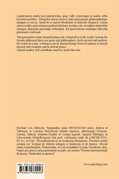 Laudat poeta multa loca pulcherrima, quae vidit visitavitque in multis orbis terrarum partibus. Alloquitur autem amicos, inter quos poetas philosophosque antiquos et novos. Quod fit et metris Horatianis et distichis elegiacis. Latine autem scribit, quia omnium gentium homines invitare vult, ut tandem inimicitias armaque deponant pacemque defendant. Ad quod litterae studiaque liberalia plurimum conferunt.