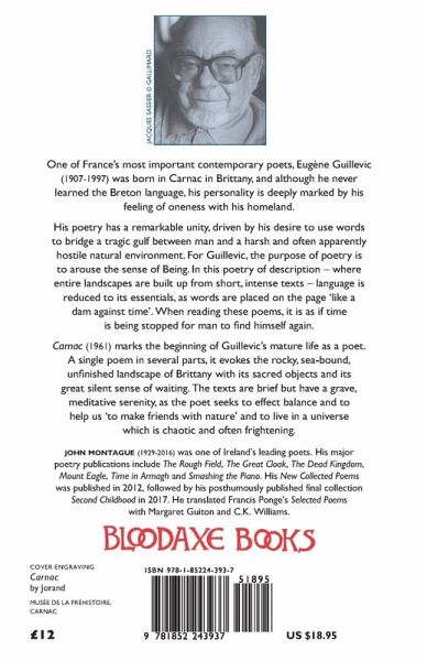 One of France's most important contemporary poets, Eugene Guillevic (1907-97) was born in Carnac in Brittany, and although he never learned the Breton language, his personality is deeply marked by his feeling of oneness with his homeland. His poetry has a remarkable unity, driven by his desire to use words to bridge a tragic gulf between man and a