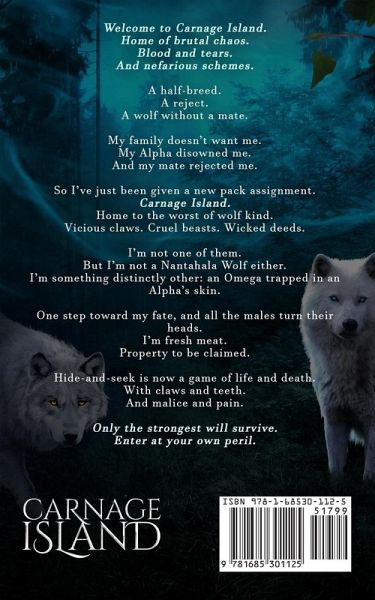 This is an alternate cover / special edition for Carnage Island Welcome to Carnage Island. Home of brutal chaos. Blood and tears. And nefarious schemes. A half-breed. A reject. A wolf without a mate. My family doesn't want me. My Alpha disowned me. And my mate rejected me. So I've just been given a new pack assignment. Carnage Island. Home to the worst of wolf kind. Vicious claws. Cruel beasts. Wicked deeds. I'm not one of them. But I'm not a Nantahala Wolf either. I'm something distinctly other: an Omega trapped in an Alpha's skin. One step toward my fate, and all the males turn their heads. I'm fresh meat. Property to be claimed. Hide-and-seek is now a game of life and death. With claws and teeth. And malice and pain. Only the strongest will survive. Enter at your own peril. Author's Note: This is a dark shifter story with Omegaverse undertones. Three Alpha males, one Omega female. There will be biting and violence because these Alphas will stop at nothing to protect their mate. And she'll claim them back just as fiercely.