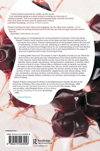 In Carnal Appetites, Elspeth Probyn charts the explosion of interest in food - from the cults that spring up around celebrity chefs, to our love/hate relationship with fast food, our fetishization of food and sex, and the impact of our modes of consumption on our identities. 'You are what you eat' the saying goes, but is the tenet truer than ever? As the range of food options proliferates in the West, our food choices become inextricably linked with our lives and lifestyles. Probyn also tackles issues that trouble society, asking questions about the nature of appetite, desire, greed and pleasure, and shedding light on subjects including: fast food, vegetarianism, food sex, cannibalism, forced feeding, and fat politics.