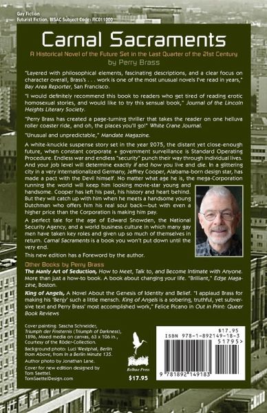 A white-knuckle suspense story set in the year 2075, the distant yet close-enough future, when constant corporate + government surveillance is Standard Operating Procedure. Endless war and endless "security" punch their way through individual lives. And your job level will determine exactly if and how you live and die. In a glittering city in a very internationalized Germany, Jeffrey Cooper, Alabama-born design star, has made a pact with the Devil himself. No matter what age he is, the mega-Corporation running the world will keep him looking movie-star young and handsome. Cooper has left his past, his history and heart behind. But they will catch up with him when he meets a handsome young Dutchman who offers him his real soul back-but with even a higher price than the Corporation is making him pay. A perfect tale for the age of Edward Snowden, the National Security Agency, and a world business culture in which many gay men have taken key roles and given up so much of themselves in return. Carnal Sacraments is a book you won't put down until the very end. This new edition has a Foreword by the author.