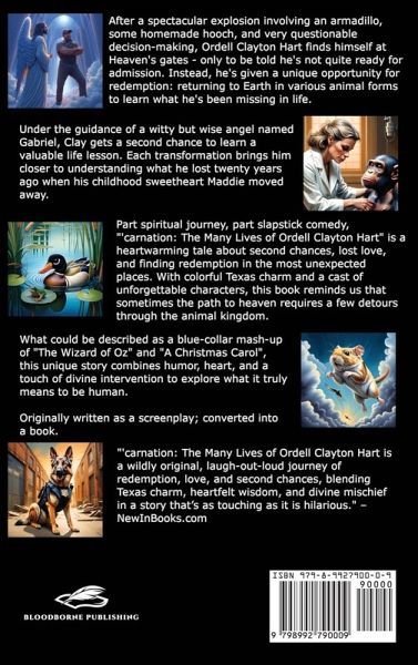 After a spectacular explosion involving an armadillo, some homemade hooch, and very questionable decision-making, Ordell Clayton Hart finds himself at Heaven's gates - only to be told he's not quite ready for admission. Instead, he's given a unique opportunity for redemption: returning to Earth in various animal forms to learn what he's been missing in life. Under the guidance of a witty but wise angel named Gabriel, Clay gets a second chance to learn a valuable life lesson. Each transformation brings him closer to understanding what he lost twenty years ago when his childhood sweetheart Maddie moved away. Part spiritual journey, part slapstick comedy, "'carnation: The Many Lives of Ordell Clayton Hart" is a heartwarming tale about second chances, lost love, and finding redemption in the most unexpected places. With colorful Texas charm and a cast of unforgettable characters, this book reminds us that sometimes the path to heaven requires a few detours through the animal kingdom. What could be described as a blue-collar mash-up of "The Wizard of Oz" and "A Christmas Carol", this unique story combines humor, heart, and a touch of divine intervention to explore what it truly means to be human. Originally written as a screenplay; converted into a book.