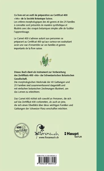 Das «Carnet Iris» ist ein praktisches Hilfsmittel zur Erlangung des Zertifikats 400 («Iris») der Schweizerischen Botanischen Gesellschaft. Es erleichtert das Erkennen aller 40 Gattungen und 25 Familien durch Skizzen, die die entscheidenden Bestimmungsmerkmale illustrieren.Das «Carnet Iris» richtet sich sowohl an Personen, die sich auf das Zertifikat 400 vorbereiten, als auch an Neugierige, die sich einen Überblick über diese wichtigsten Familien und Gattungen und um Sicherheit in deren Ansprache verschaffen möchten.