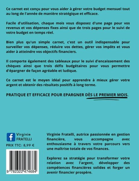 Passionnée par le développement personnel, Virginie Fratelli crée des livres pratiques afin d' aider les lecteurs à atteindre leurs objectifs. Elle propose des carnets pratiques, tels que des carnets de budget pour la gestion financière au quotidien, carnet de recettes pour consigner vos meilleures recettes, etc. Elle est également l'autrice de livres portant sur des sujets tels que l'hypersensibilité, la gestion du stress et la confiance en soi. Toujours en quête de nouveaux projets, elle travaille constamment sur de nouvelles idées pour aider à améliorer le quotidien. Particulièrement respectueuse de l'environnement, elle a choisi de faire imprimer tous ses livres à la demande pour réduire son empreinte carbone et préserver notre planète. En achetant l'un de ses livres, les lecteurs soutiennent cette initiative éco-responsable. Pour rester informé de ses projets à venir et partager votre expérience, vous pouvez dès à présent vous abonner à sa page Facebook "Virginie Fratelli".
