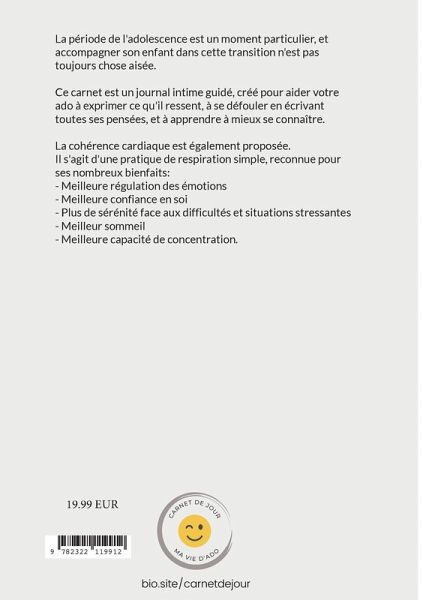 La période de l'adolescence est un moment particulier, et accompagner son enfant dans cette transition n'est pas toujours chose aisée. Ce carnet est un journal intime guidé créé pour aider votre ado à exprimer ce qu'il ressent, à se défouler en écrivant toutes ses pensées, et à apprendre à mieux se connaître.La cohérence cardiaque est également proposée. Il s'agit d'une pratique de respiration simple, reconnue pour ses nombreux bienfaits:- Meilleure régulation des émotions- Meilleure confiance en soi- Plus de sérénité face aux difficultés et situations stressantes- Meilleur sommeil- Meilleure capacité de concentration.