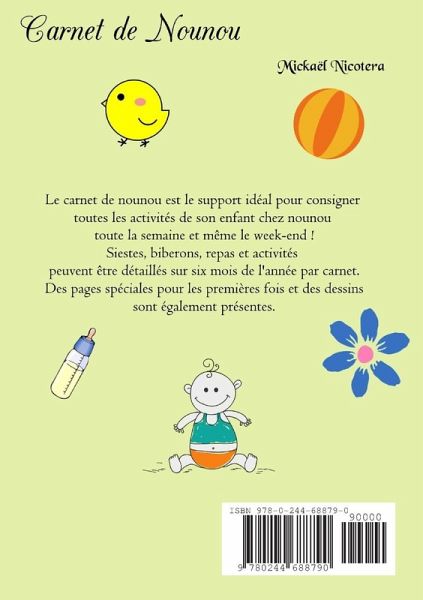 Le carnet de nounou est le support idéal pour consigner toutes les activités de son enfant chez nounou toute la semaine et même le week-end ! Siestes, biberons, repas et activités peuvent être détaillés sur six mois de l'année par carnet. Des pages spéciales pour les premières fois et des dessins sont également présentes.