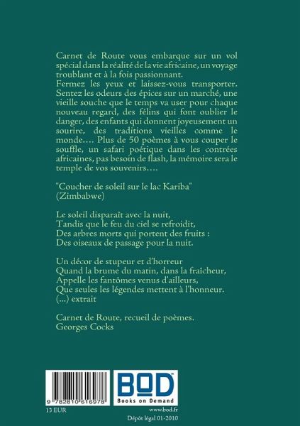 Carnet de route vous embarque sur un vol spécial dans la réalité de la vie africaine, un voyage troublant et à la fois passionnant. Fermez les yeux et laissez-vous transporter. Sentez les odeurs des épices sur un marché, une vieille souche que le temps va user pour chaque nouveau regard, des félins qui font oublier le danger, des enfants qui donnent joyeusement un sourire, des traditions vieilles comme le monde¿. Plus de 50 poèmes à vous couper le souffle, un safari poétique dans les contrées africaines, pas besoin de flash, la mémoire sera le temple de vos souvenirs¿.