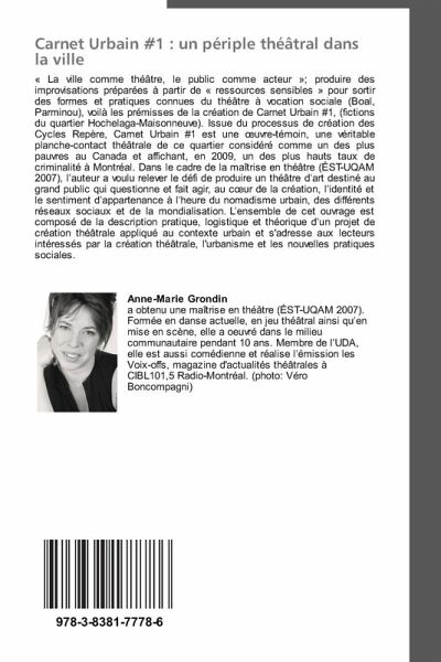 " La ville comme théâtre, le public comme acteur "; produire des improvisations préparées à partir de " ressources sensibles " pour sortir des formes et pratiques connues du théâtre à vocation sociale (Boal, Parminou), voilà les prémisses de la création de Carnet Urbain Nr.1, (fictions du quartier Hochelaga-Maisonneuve). Issue du processus de création des Cycles Repère, Carnet Urbain Nr.1 est une uvre-témoin, une véritable planche-contact théâtrale de ce quartier considéré comme un des plus pauvres au Canada et affichant, en 2009, un des plus hauts taux de criminalité à Montréal. Dans le cadre de la maîtrise en théâtre (ÉST-UQAM 2007), l auteur a voulu relever le défi de produire un théâtre d art destiné au grand public qui questionne et fait agir, au c ur de la création, l'identité et le sentiment d appartenance à l heure du nomadisme urbain, des différents réseaux sociaux et de la mondialisation. L'ensemble de cet ouvrage est composé de la description pratique, logistique et théorique d un projet de création théâtrale appliqué au contexte urbain et s'adresse aux lecteurs intéressés par la création théâtrale, l'urbanisme et les nouvelles pratiques sociales.