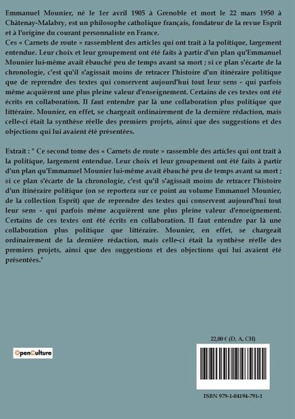 Emmanuel Mounier, né le 1er avril 1905 à Grenoble et mort le 22 mars 1950 à Châtenay-Malabry, est un philosophe catholique français, fondateur de la revue Esprit et à l'origine du courant personnaliste en France. Ces « Carnets de route » rassemblent des articles qui ont trait à la politique, largement entendue. Leur choix et leur groupement ont été faits à partir d'un plan qu'Emmanuel Mounier lui-même avait ébauché peu de temps avant sa mort ; si ce plan s'écarte de la chronologie, c'est qu'il s'agissait moins de retracer l'histoire d'un itinéraire politique que de reprendre des textes qui conservent aujourd'hui tout leur sens - qui parfois même acquièrent une plus pleine valeur d'enseignement. Certains de ces textes ont été écrits en collaboration. Il faut entendre par là une collaboration plus politique que littéraire. Mounier, en effet, se chargeait ordinairement de la dernière rédaction, mais celle-ci était la synthèse réelle des premiers projets, ainsi que des suggestions et des objections qui lui avaient été présentées. Extrait : " Ce second tome des « Carnets de route » rassemble des articles qui ont trait à la politique, largement entendue. Leur choix et leur groupement ont été faits à partir d'un plan qu'Emmanuel Mounier lui-même avait ébauché peu de temps avant sa mort ; si ce plan s'écarte de la chronologie, c'est qu'il s'agissait moins de retracer l'histoire d'un itinéraire politique (on se reportera sur ce point au volume Emmanuel Mounier, de la collection Esprit) que de reprendre des textes qui conservent aujourd'hui tout leur sens - qui parfois même acquièrent une plus pleine valeur d'enseignement. Certains de ces textes ont été écrits en collaboration. Il faut entendre par là une collaboration plus politique que littéraire. Mounier, en effet, se chargeait ordinairement de la dernière rédaction, mais celle-ci était la synthèse réelle des premiers projets, ainsi que des suggestions et des objections qui lui avaient été présentées."