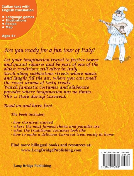A book for language students and anyone interested in Italian culture and traditions Practice Italian while learning all about one of the oldest traditions still alive in Italy: Carnival, the festival that precedes Lent and includes costume parades, parties, special foods and more. Colorful illustrations and text in Italian and English will make learning fun for students of all ages. Use as an introduction to Italian language and traditions, as school activity and language practice for College students and travelers. The book includes: - how Carnival started - where the most famous shows and parades are - what the traditional costumes look like - how to make a delicious Carnival treat easily at home - a map of Italy that shows the locations mentioned in the book - five pages of language activities - many colorful illustrations - several pages with large print suitable for young readers. Bilingual book: Italian text with English translation. Language level: Intermediate