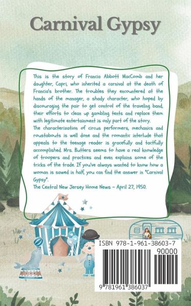 The new book is the story of Francia Abbot Maccomb and her daughter, Capri, who inherited a carnival at the death of Francia's brother. The troubles they encountered at the hands of the manager, a shady character who hoped by discouraging the pair to get control of the traveling band, their efforts to clean up gambling tents and replace them with legitimate entertainment is only part of the story. The characterization of circus performers, mechanics and roustabouts is well done and the romantic interlude that appeals to the teen ager reader is gracefully and tactfully accomplished. Mrs. Butters seems to have a real knowledge of carnival jargon, troupers and practices and even explains some of the tricks of the trade. If you've always wanted to know how a woman is sawed in half, you can find the answer in "Carnival Gypsy".