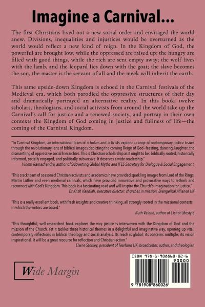 The first Christians lived out a new social order and envisaged the world anew. Divisions, inequalities and injustices would be overturned as the world would reflect a new kind of reign. In the Kingdom of God, the powerful are brought low, while the oppressed are raised up; the hungry are filled with good things, while the rich are sent empty away; the wolf lives with the lamb, and the leopard lies down with the goat; the slave becomes the son, the master is the servant of all and the meek will inherit the earth. This same upside-down Kingdom is echoed in the Carnival festivals of the Medieval era, which both parodied the oppressive structures of their day and dramatically portrayed an alternative reality. In this book, twelve scholars, theologians, and social activists from around the world take up the Carnival's call for justice and a renewed society, and portray in their own contexts the Kingdom of God coming in justice and fullness of life - the coming of the Carnival Kingdom."