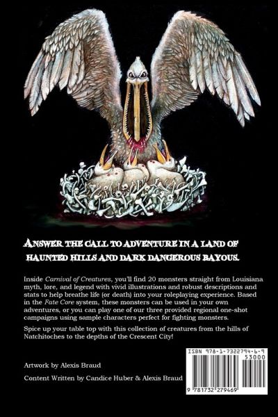 Answer the call to adventure in a land of haunted rolling hills and dark dangerous bayous. Inside Carnival of Creatures, you'll find 20 monsters straight from Louisiana myth, lore, and legend with vivid illustrations and robust descriptions and stats to help breathe life (or death) into your roleplaying experience. Based in the Fate Core system, these monsters can be used in your own adventures, or you can play one of our three provided regional one-shot adventures. Spice up your table top with this collection of creatures from the hills of Natchitoches to the depths of the Crescent City!