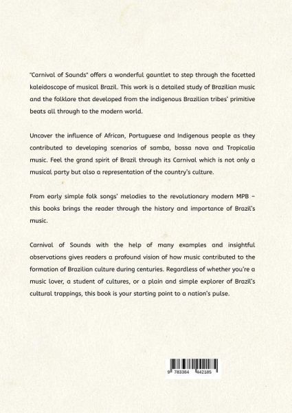 "Carnival of Sounds" offers a wonderful gauntlet to step through the facetted kaleidoscope of musical Brazil. This work is a detailed study of Brazilian music and the folklore that developed from the indigenous Brazilian tribes' primitive beats all through to the modern world. Uncover the influence of African, Portuguese and Indigenous people as they contributed to developing scenarios of samba, bossa nova and Tropicalia music. Feel the grand spirit of Brazil through its Carnival which is not only a musical party but also a representation of the country's culture. From early simple folk songs' melodies to the revolutionary modern MPB - this books brings the reader through the history and importance of Brazil's music. Carnival of Sounds with the help of many examples and insightful observations gives readers a profound vision of how music contributed to the formation of Brazilian culture during centuries. Regardless of whether you're a music lover, a student of cultures, or a plain and simple explorer of Brazil's cultural trappings, this book is your starting point to a nation's pulse.