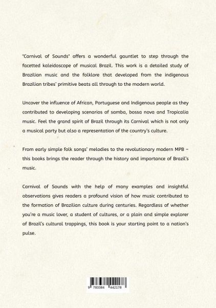 "Carnival of Sounds" offers a wonderful gauntlet to step through the facetted kaleidoscope of musical Brazil. This work is a detailed study of Brazilian music and the folklore that developed from the indigenous Brazilian tribes' primitive beats all through to the modern world. Uncover the influence of African, Portuguese and Indigenous people as they contributed to developing scenarios of samba, bossa nova and Tropicalia music. Feel the grand spirit of Brazil through its Carnival which is not only a musical party but also a representation of the country's culture. From early simple folk songs' melodies to the revolutionary modern MPB - this books brings the reader through the history and importance of Brazil's music. Carnival of Sounds with the help of many examples and insightful observations gives readers a profound vision of how music contributed to the formation of Brazilian culture during centuries. Regardless of whether you're a music lover, a student of cultures, or a plain and simple explorer of Brazil's cultural trappings, this book is your starting point to a nation's pulse.