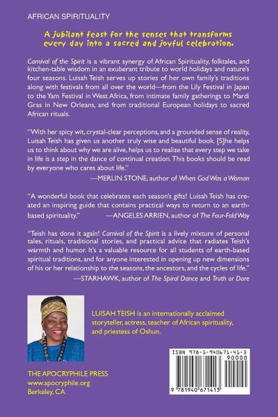 Carnival of the Spirit is a vibrant synergy of African Spirituality, folktales, and kitchen-table wisdom in an exuberant tribute to world holidays and nature's four seasons. Luisah Teish serves up stories of her own family's traditions along with festivals from all over the world-from the Lily Festival in Japan to the Yam Festival in West Africa, from intimate family gatherings to Mardi Gras in New Orleans, and from traditional European holidays to sacred African rituals.