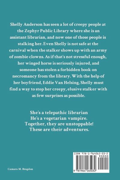 Shelly Anderson has seen a lot of creepy people at the Zephyr Public Library where she is an assistant librarian, and now one of those people is stalking her. Even Shelly is not safe at the carnival when the stalker shows up with an army of zombie clowns. As if that's not stressful enough, her winged horse is seriously injured, and someone has stolen a forbidden book on necromancy from the library. With the help of her boyfriend, Eddie Van Helsing, Shelly must find a way to stop her creepy, elusive stalker with as few surprises as possible.