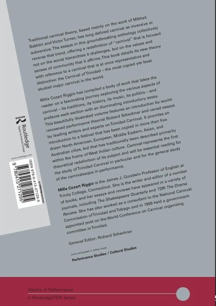 Milla Cozart Riggio is the James J.Goodwin Professor of English at Trinity College, Hartford, Connecticut. Her publications and research interests focus on Carnival, medieval drama and Shakespeare and her essays and reviews have appeared in a variety of journals, including The Shakespeare Quarterly and TDR. She is the editor of The Wisdom Symposium, Ta'ziyeh: Ritual and Drama in Iran and Teaching Shakespeare Through Performance. She has also worked as a consultant to the National Carnival Commission of Trinidad and Tobago and in 1999 held a government-appointed post on the World Conference on Carnival organising committee in Trinidad.