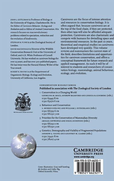 Carnivores are the focus of intense attention and resources in conservation biology. It is often argued that, because carnivores are at the top of the food chain, if they are protected, then other taxa will also be afforded adequate protection. Carnivores are also charismatic and compete with humans for dwindling space and environmental resources. In the past 10 years, theoretical and empirical studies on carnivores have developed very quickly. This volume reviews and summarises the current state of the field, describes limitations and opportunities for carnivore conservation, and offers a conceptual framework for future research and applied management. As such it will be of interest to students and researchers of conservation biology, mammalogy, animal behaviour, ecology and evolution.