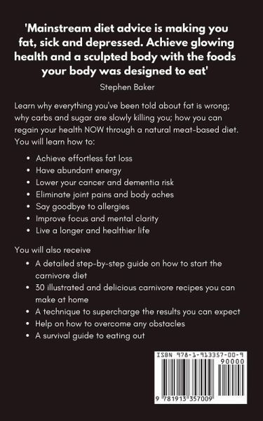 'Mainstream diet advice is making you fat, sick and depressed. Achieve glowing health and a sculpted body with the foods your body was designed to eat' - Stephen Baker In this well-researched and professionally presented book, veteran health writer Stephen Baker shows you how everything you've been told about fat is wrong; why carbs and sugar are slowly killing you; how you can regain your health NOW through a natural meat-based diet. You will learn how to: Achieve effortless fat loss Have abundant energy Lower your cancer and dementia risk Eliminate joint pains and body aches Say goodbye to allergies Improve focus and mental clarity Live a longer and healthier life You will also receive: A detailed step-by-step guide on how to start the carnivore diet 30 illustrated and delicious carnivore recipes you can make at home A technique to supercharge the results you can expect Help on how to overcome common obstacles A survival guide to eating out If you have read Good Calories, Bad Calories by Gary Taubes or Grain Brain by David Perlmutter, The Carnivore Diet Bible is the actionable blueprint you need to transform your health.
