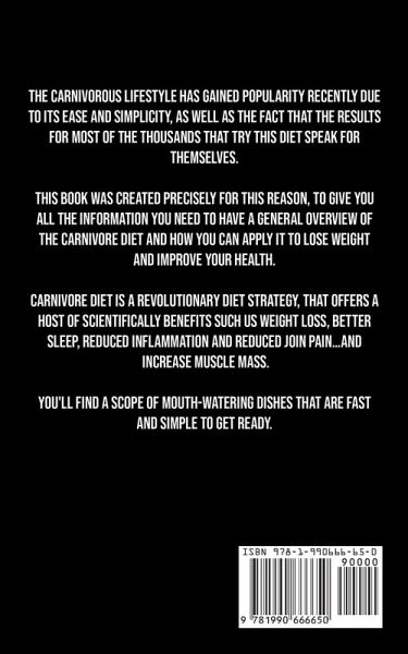 The carnivorous lifestyle has gained popularity recently due to its ease and simplicity, as well as the fact that the results for most of the thousands that try this diet speak for themselves.This book was created precisely for this reason, to give you all the information you need to have a general overview of the carnivore diet and how you can apply it to lose weight and improve your health.Carnivore Diet is a revolutionary diet strategy, that offers a host of scientifically benefits such us weight loss, better sleep, reduced inflammation and reduced join pain...and increase muscle mass.You'll find a scope of mouth-watering dishes that are fast and simple to get ready.