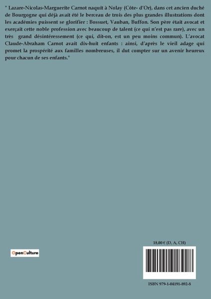 " Lazare-Nicolas-Marguerite Carnot naquit à Nolay (Côte- d¿Or), dans cet ancien duché de Bourgogne qui déjà avait été le berceau de trois des plus grandes illustrations dont les académies puissent se glorifier : Bossuet, Vauban, Buffon. Son père était avocat et exerçait cette noble profession avec beaucoup de talent (ce qui n¿est pas rare), avec un très grand désintéressement (ce qui, dit-on, est un peu moins commun). L¿avocat Claude-Abraham Carnot avait dix-huit enfants : ainsi, d¿après le vieil adage qui promet la prospérité aux familles nombreuses, il dut compter sur un avenir heureux pour chacun de ses enfants."