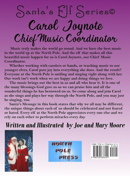 Carol Joynote, Chief Music Coordinator by Joe Moore is a joyful, rhyming picture book from the Santa's Elf Series, celebrating the power of music, diversity, and togetherness at the North Pole. Carol Joynote is the elf behind every festive tune-leading carolers, coordinating bands, and teaching young elves to sing and play with heart. Story Highlights Carol's music fills Santa's workshop with happiness, turning hard work into harmony. Her melodies lift spirits, unite elves, and remind readers that joy is a gift meant to be shared. As Carol says, "Music brings out the best in us and all who hear it." Santa's Message At the end of the story, Santa shares a powerful reminder: "Though we may be different, our unique gifts should be celebrated-not feared or hated." It's a message of inclusion, empathy, and appreciation for every voice in the chorus. Themes & AppealCelebrates music as a universal language Encourages diversity, teamwork, and joy Perfect for holiday read-alouds, music-themed lessons, and classroom discussions With vibrant illustrations by Mary Moore and lyrical verse that invites readers to sing along, Carol's story is a heartwarming addition to any holiday tradition.