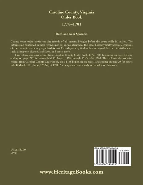 County court order books contain records of all matters brought before the court while in session. The information contained in these records may not appear elsewhere. The order books typically provide a synopsis of court cases in a relatively organized format. Records you may find include rulings of the court in civil matters such as property disputes and slaves, and much more. This volume contains records from Caroline County Order Book, 1777–1780, beginning on page 104 and ending on page 243 for courts held 13 August 1778 through 15 October 1780. This volume also contains records from Caroline County Order Book, 1781–1785 beginning on page 1 and ending on page 20 for courts held 8 March 1781 through 9 August 1781. An every-name index adds to the value of this work.