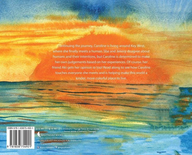 Continuing the journey, Caroline is living around Key West, where she finally meets a human. She and Jimmy disagree about humans and their intentions, but Caroline is determined to make her own judgements based on her experiences. Of course, her friend Aki gets her opinion in too! Read along to see how Caroline touches everyone she meets and is helping make this world a kinder, more colorful place to live.