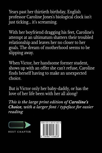 Years past her thirtieth birthday, English professor Caroline Jones's biological clock isn't just ticking, it's screaming. With her boyfriend dragging his feet, Caroline's attempt at an ultimatum shatters their troubled relationship and leaves her no closer to her goals. The dream of motherhood seems to be slipping away. When Victor, her handsome former student, shows up with an offer she can't refuse, Caroline finds herself having to make an unexpected choice. But is Victor only her baby-daddy, or has the love of her life been with her all along? This book contains graphic sex and is not suitable for readers under the age of 18. This is the large print edition of Caroline's Choice, with a larger font / typeface for easier reading.