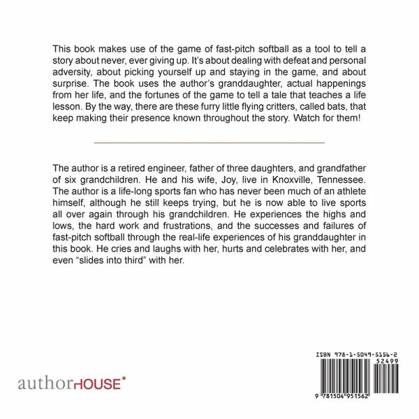 This book makes use of the game of fast-pitch softball as a tool to tell a story about never, ever giving up. It's about dealing with defeat and personal adversity, about picking yourself up and staying in the game, and about surprise. The book uses the author's granddaughter, actual happenings from her life, and the fortunes of the game to tell a tale that teaches a life lesson. By the way, there are these furry little flying critters, called bats, that keep making their presence known throughout the story. Watch for them!
