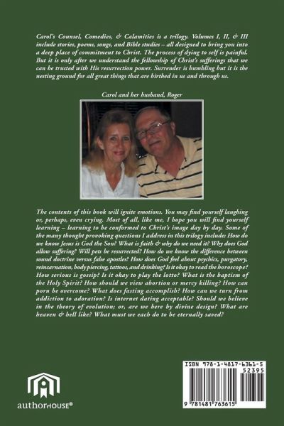Carol's Counsel, Comedies, & Calamities is a trilogy. Volumes I, II, & III include stories, poems, songs, and Bible studies - all designed to bring you into a deep place of commitment to Christ. The process of dying to self is painful. But it is only after we understand the fellowship of Christ's sufferings that we can be trusted with His resurrection power. Surrender is humbling but it is the nesting ground for all great things that are birthed in us and through us. The contents of this book will ignite emotions. You may find yourself laughing or, perhaps, even crying. Most of all, like me, I hope you will find yourself learning - learning to be conformed to Christ's image day by day. Some of the many thought provoking questions I address in this trilogy include: How do we know Jesus is God the Son? What is faith & why do we need it? Why does God allow suffering? Will pets be resurrected? How do we know the difference between sound doctrine versus false apostles? How does God feel about psychics, purgatory, reincarnation, body piercing, tattoos, and drinking? Is it okay to read the horoscope? How serious is gossip? Is it okay to play the lotto? What is the baptism of the Holy Spirit? How should we view abortion or mercy killing? How can porn be overcome? What does fasting accomplish? How can we turn from addiction to adoration? Is internet dating acceptable? Should we believe in the theory of evolution; or, are we here by divine design? What are heaven & hell like? What must we each do to be eternally saved?