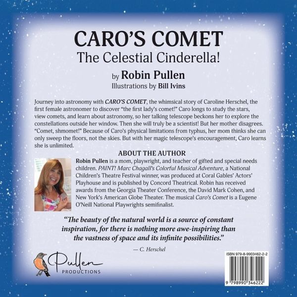 Journey into astronomy with Caro's Comet: The Celestial Cinderella, the whimsical story of Caroline Herschel, the first female astronomer to discover "the first lady's comet!" Caro longs to study the stars, view comets, and learn about astronomy, so her talking telescope beckons her to explore the constellations outside her window. Then she will truly be a scientist! But her mother disagrees. "Comet, shmomet!" Because of Caro's physical limitations from typhus, her mom thinks she can only sweep the floors, not the skies. But with her magic telescope's encouragement, Caro learns she is unlimited. On every page a sparkling light captivates Caro. Famously known as the real-life "Celestial Cinderella," she uncovers the mysteries of the night sky and becomes the first female astronomer to earn a salary. Caro was even awarded the Gold Medal of Science! An enchanting story for young readers, filled with purpose, creativity, courage, and strength, persistent Caro doesn't give up, believing in herself even when others won't. Incorporating Math and Science standards, colorful cartoon illustrations by Bill Ivins capture Caro's real-life quest to map the stars! Perfect for...Elementary school-aged kids 4-8 who love science, discovery, astronomy, nature, and STEM Parents, grandparents, and family members of young children seeking a fun way to help them learn about the night sky Educators of young minds who want to teach kids about their power to overcome obstacles and achieve their dreams Grade school teachers and educators looking to engage their students into the exciting study of the stars and planets Media specialists and librarians seeking stories of real-life female scientists and astronomers A gift for birthdays, holidays, and days of school achievements "Anyone can scan the stars, but it takes someone strong to reach their dreams." - Caro's Comet: The Celestial Cinderella