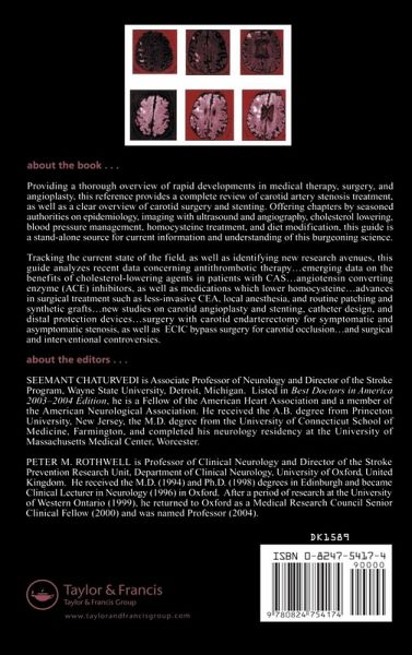 Providing a thorough overview of rapid developments in medical therapy, surgery, and angioplasty, this reference provides a complete review of carotid artery stenosis treatment, as well as a clear overview of carotid surgery and stenting. Offering chapters by seasoned authorities on epidemiology, imaging with ultrasound and angiography, cholesterol lowering, blood pressure management, homocysteine treatment, and diet modification, this guide is a stand-alone source for current information and understanding of this burgeoning science.