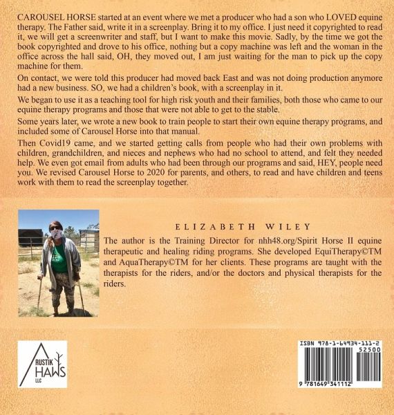 CAROUSEL HORSE started at an event where we met a producer who has a son who LOVED equine therapy. The Father said, write it in a screenplay. Bring it to my office. I just need it copyrighted to read it, we will get a screenwriter and staff, but I want to make this movie, Sadly, by the time we got the book copyrighted and drove to his office, nothing but a copy machine was left and the woman in the office across the hall said, OH, they moved out, I am just waiting for the man to pick up the copy machine fro them.On contact, we were told his producer had moved back east and was not doing production anymore had a new business. SO, we had a children's book, with a screenplay in it.We began to use it as a teaching tool for high risk youth and their families, both those who came to our equine therapy programs and those that were not able to get to the stable.Some years later, we wrote a new book train people to start their own equine therapy programs, and included some of Carousel Horse into that manual.Then Covid19 came, and we started getting calls from people who had their own problems with children, grandchildren, and nieces and nephews who had no school to attend, and felt they needed help. We even got email from adults who had been through our programs and said, HEY, people need you. We revised Carousel Horse to 2020 for parents, and others, to read and have children and teens work with them to read the screenplay together.