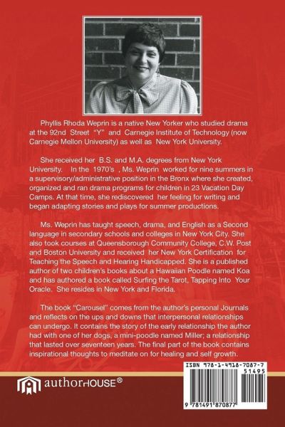The book "Carousel" comes from the author's personal Journals and reflects on the ups and downs that interpersonal relationships can undergo. It contains the story of the early relationship the author had with one of her dogs, a mini-poodle named Miller; a relationship that lasted over seventeen years. The final part of the book contains inspirational thoughts to meditate on for healing and self growth.