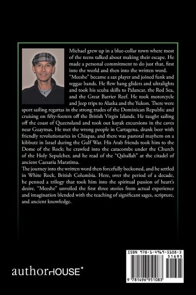 Michael grew up in a blue-collar town where most of the teens talked about making their escape. He made a personal commitment to do just that, first into the world and then into the written word. Meeshe became a sax player and joined funk and reggae bands. He flew hang gliders and ultralights and took his scuba skills to Palancar, the Red Sea, and the Great Barrier Reef. He took motorcycle and Jeep trips to Alaska and the Yukon. There were sport sailing regattas in the strong trades of the Dominican Republic and cruising on fifty-footers off the British Virgin Islands. He taught sailing off the coast of Queensland and took out kayak excursions in the caves near Guaymas. He met the wrong people in Cartagena, drank beer with friendly revolutionaries in Chiapas, and there was pastoral mayhem on a kibbutz in Israel during the Gulf War. His Arab friends took him to the Dome of the Rock; he crawled into the catacombs under the Church of the Holy Sepulcher, and he read of the Qaballah at the citadel of ancient Caesaria Maratima. The journey into the written word then forcefully beckoned, and he settled in White Rock, British Columbia. Here, over the period of a decade, he penned a trilogy that took him into the spiritual passion of hearts desire. Meeshe unveiled the first three stories from actual experience and imagination blended with the teaching of significant sages, scripture, and ancient knowledge.
