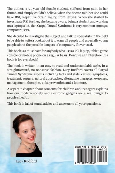 carpal tunnel syndrome Carpal Tunnel Syndrome, Cts. Carpal Tunnel Syndrome Cts Causes, Symptoms, Treatment, Exercises, Management, Therapies and Prevention. The author, a 21 year old female student, suffered from pain in her thumb and simply couldn't believe when the doctor told her she could have RSI, Repetitive Strain Injury, from texting. When she started to investigate RSI further, she became aware, being a student and working on a laptop a lot, that Carpal Tunnel Syndrome is very common amongst computer users.She decided to investigate the subject and talk to specialists in the field to be able to write a book about it to warn all people and especially young people about the possible dangers of computers, if over used.This book is a must have for anybody who uses a PC, laptop, tablet, game console or mobile phone on a regular basis. Don't we all? Therefore this book is for everybody!The book is written in an easy to read and understandable style. In a straightforward, no nonsense fashion, Lucy Rudford covers all Carpal Tunnel Syndrome aspects including facts and stats, causes, symptoms, treatment, surgery, natural approaches, alternative therapies, exercises, management, therapies, aids, prevention and a lot more.A separate chapter about concerns for children and teenagers explains how our modern society and electronic gadgets are a real danger to people's health.This book is full of sound advice and answers to all your questions with lots of treatment and prevention advice."Real life stories inside from sufferers"!