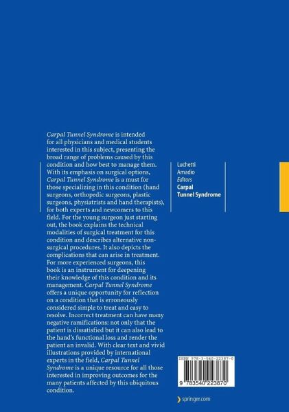 Carpal Tunnel Syndrome, with its surgical profile, is a must for those specialising in this condition (hand surgeons, orthopaedic surgeons, plastic surgeons, physiatrists and hand physical therapists), for both experts and newcomers to this field. For the young surgeon just starting out, the book explains the technical modalities of surgical treatment for this condition and describes alternative non-surgical procedures. It also depicts the complications that can arise in treatment. For more experienced surgeons, this book is an instrument for deepening their knowledge of this condition and its management. It can be considered a moment for reflection on a condition that is erroneously considered simple to treat and easy to resolve. The surgical chapters compare various complications as well as various conservative and rehabilitative treatment options, thus underlining that this condition must not be underestimated. Incorrect treatment can have many negative ramifications: not only that the patient is dissatisfied but it can also lead to the hand's functional loss and render the patient an invalid. This book is also intended for all physicians and medical students interested in this subject, presenting the broad range of problems caused by this condition and how best to manage them.