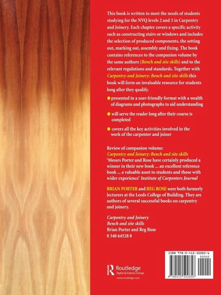This highly illustrated textbook is written to meet the needs of candidates studying for the NVQ levels 2 and 3 in Carpentry and Joinery, and other courses at this level. Each chapter covers a specific activity such as constructing stairs or windows and includes the selection of produced components, setting out, marking out, assembly and fixing.The book contains references to the companion volume by the same authors (Bench and Site Skills) and to the relevant regulations and standards. Together with Carpentry and Joinery: Bench and Site Skills this book will form an invaluable resource for students long after they qualify.Brian Porter and Reg Rose were both formerly lecturers at the Leeds College of Building. They are authors of several successful books on carpentry and joinery.
