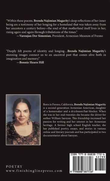 "Within these poems, Brenda Najimian Magarity's deep reflections of her inner being are a testimony of her longing for a homeland that was taken away from her ancestors a century before-the soul of that motherland itself lives in her, rising again and again through tribulations of the times." -Varoujan Der Simonian, President, Armenian Museum of Fresno "Deeply felt poems of identity and longing...Brenda Najimian Magarity's stunning images connect us to an ancestral past that comes alive both in imagination and memory." -Bonnie Hearn Hill