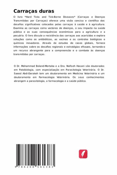 O livro *Hard Ticks and Tick-Borne Diseases* (Carraças e Doenças Transmitidas por Carraças) oferece uma visão concisa e científica dos desafios significativos colocados pelas carraças à saúde e à agricultura. Examina as carraças como vectores de doenças, o seu impacto na saúde pública e as suas consequências económicas para a agricultura e a pecuária. O livro discute a resistência das carraças aos acaricidas e explora soluções como os antibióticos, as vacinas e os controlos biológicos e químicos inovadores. Através de estudos de casos globais, fornece informações sobre os desafios regionais e estratégias eficazes, tornando-o um recurso abrangente para a compreensão e o combate às doenças transmitidas por carraças.